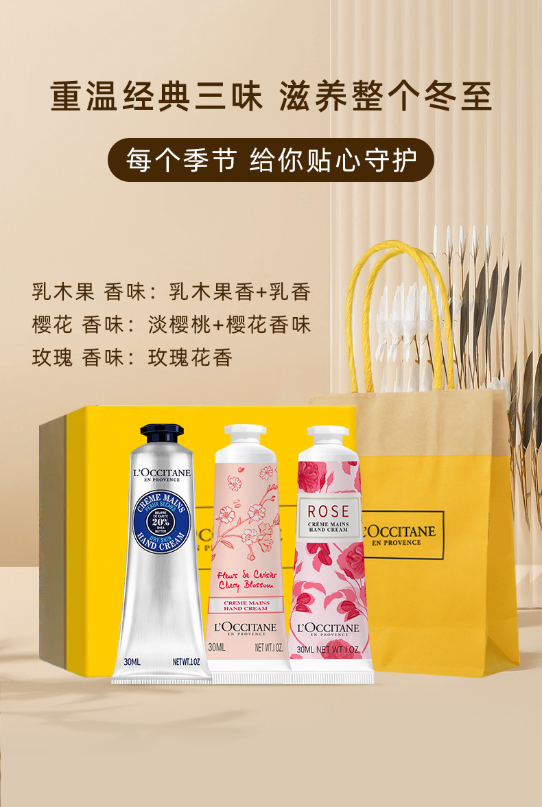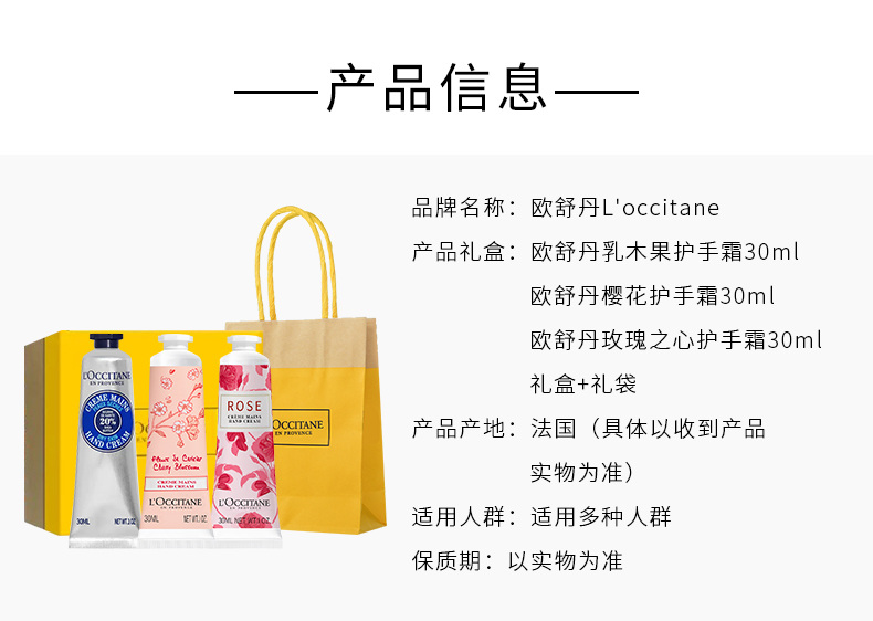 配置: 歐舒丹櫻花護(hù)手霜30ml 歐舒丹乳木果護(hù)手霜30ml 歐舒丹玫瑰之心手霜30ml